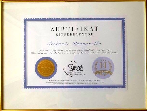 - Dipl. zert. Hypnosetherapeutin VSH/NGH, Palacios Relations GmbH, mit Fachvertiefung Kinderhypnose