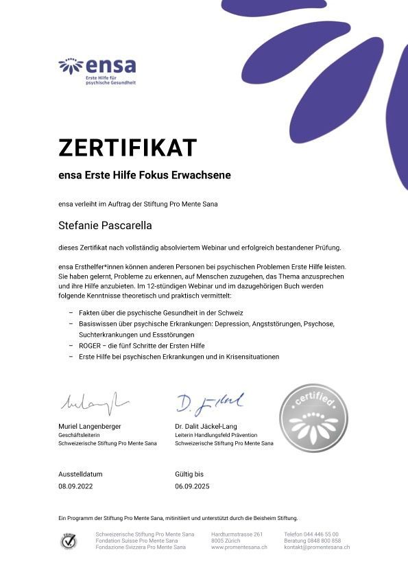 - Ersthelfer-Zertifikat ENSA, Erste Hilfe für psychische Gesundheit